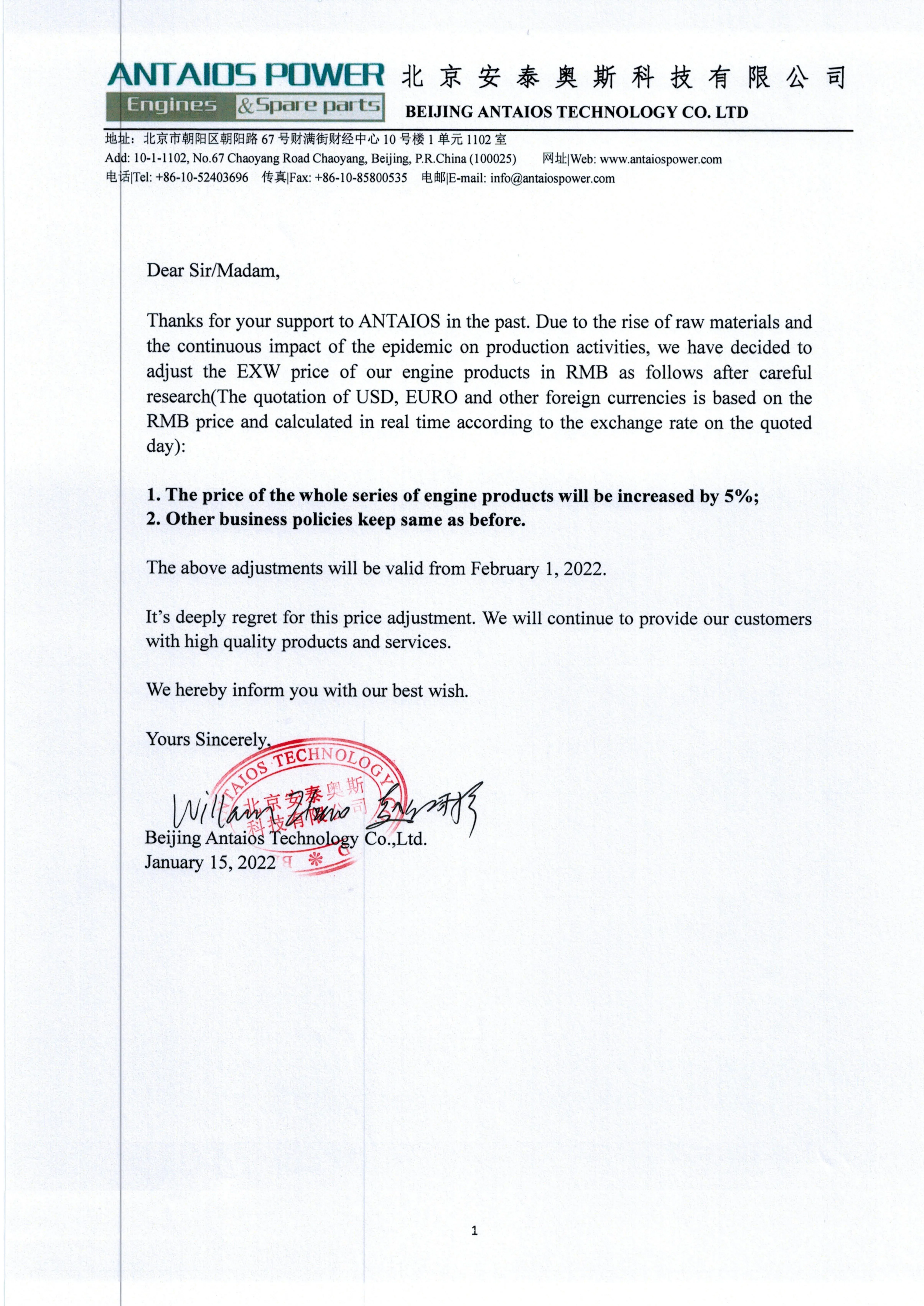 Thanks for your support to ANTAIOS in the past. Due to the rise of raw materials and the continuous impact of the epidemic on production activities, we have decided to adjust the EXW price of our engine products in RMB as follows after careful research(The quotation of USD, EURO and other foreign currencies is based on the RMB price and calculated in real time according to the exchange rate on the quoted day):
